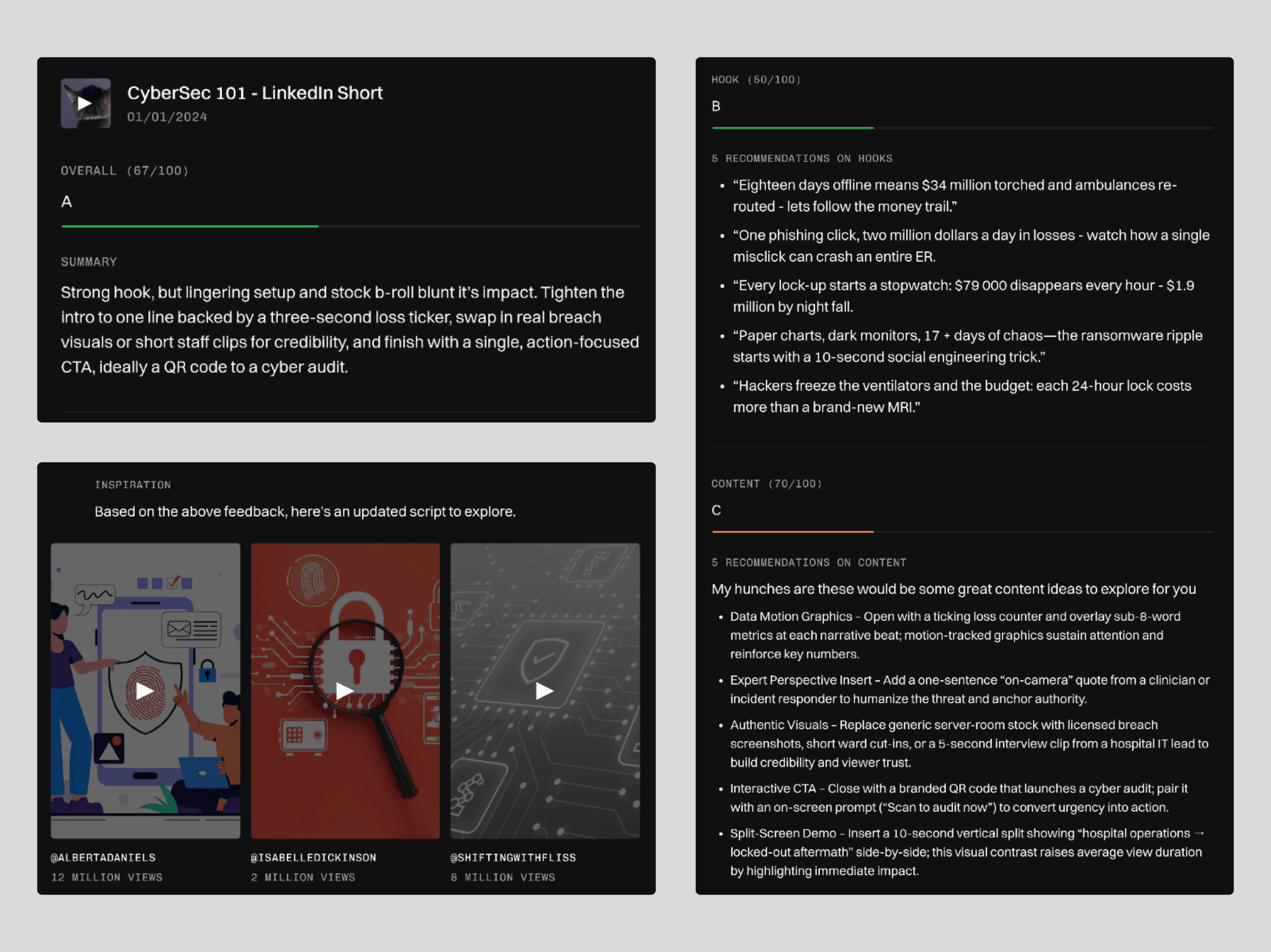 Clipcoach maximises viewership and retention by analysing winning videos and the elements that made them great and giving users guidance, turning anyone into a great content creator.